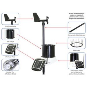 風速計、雨量計、温度センサー、湿度センサー、ソーラーパワーパネル、バードガード、風速計取付マスト